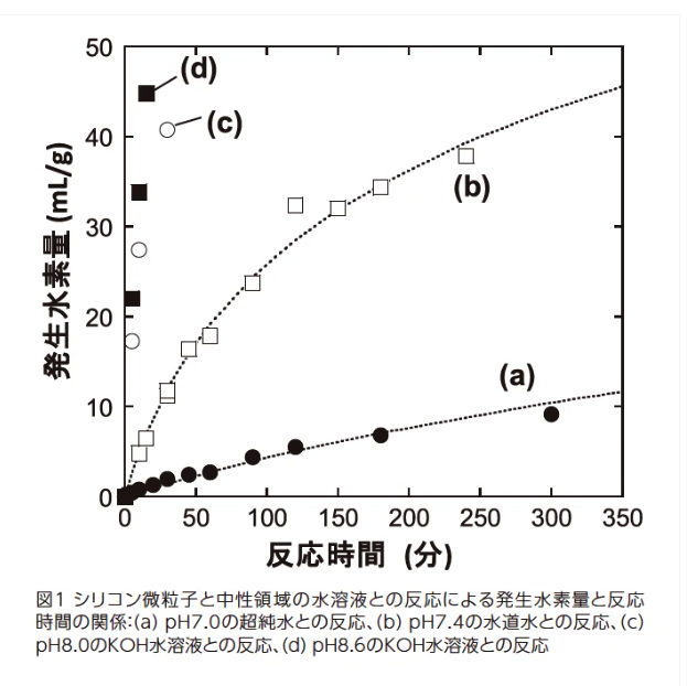 「小林悠輝、小林光、今村良一、島田昌一、「シリコン製剤による体内水素発生と医薬応用」、ケミカルタイムズ(関東化学株式会社のウェブサイトで公開)、2019年10月」より。この図のオリジナルは、Yuki Kobayashi, Shinsuke Matsuda, Kentaro Imamura, Hikaru Kobayashi, "Hydrogen generation by reaction of Si nanopowder with neutral water", J. Nanopart. Res. 19(2017) 176 にFig.2として掲載されている。