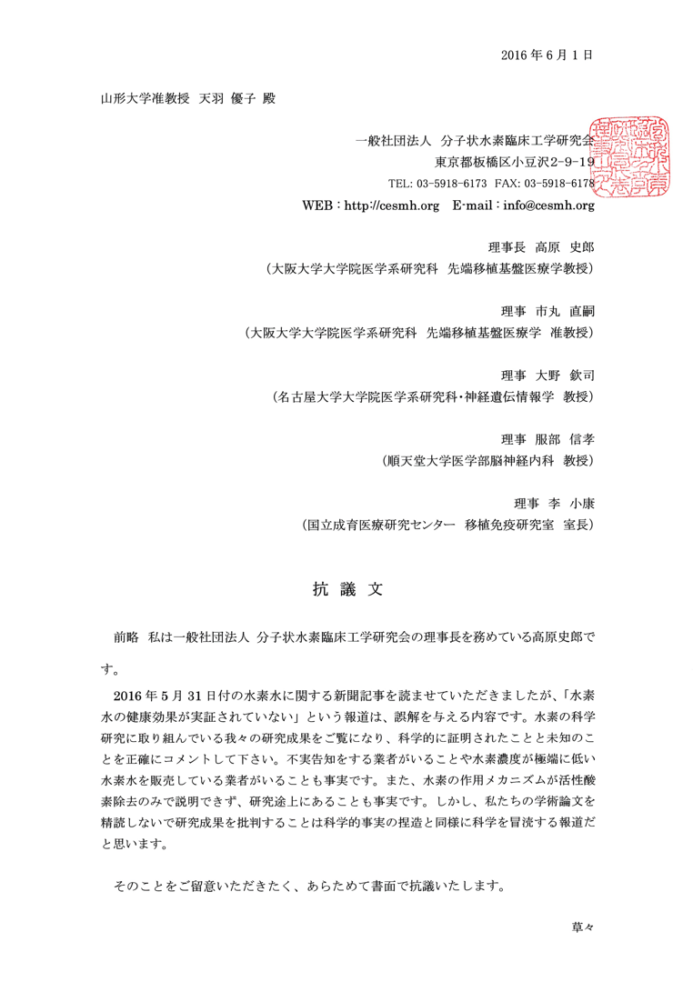 分子状水素臨床工学研究会のクレームに反論する(2016/06/08)